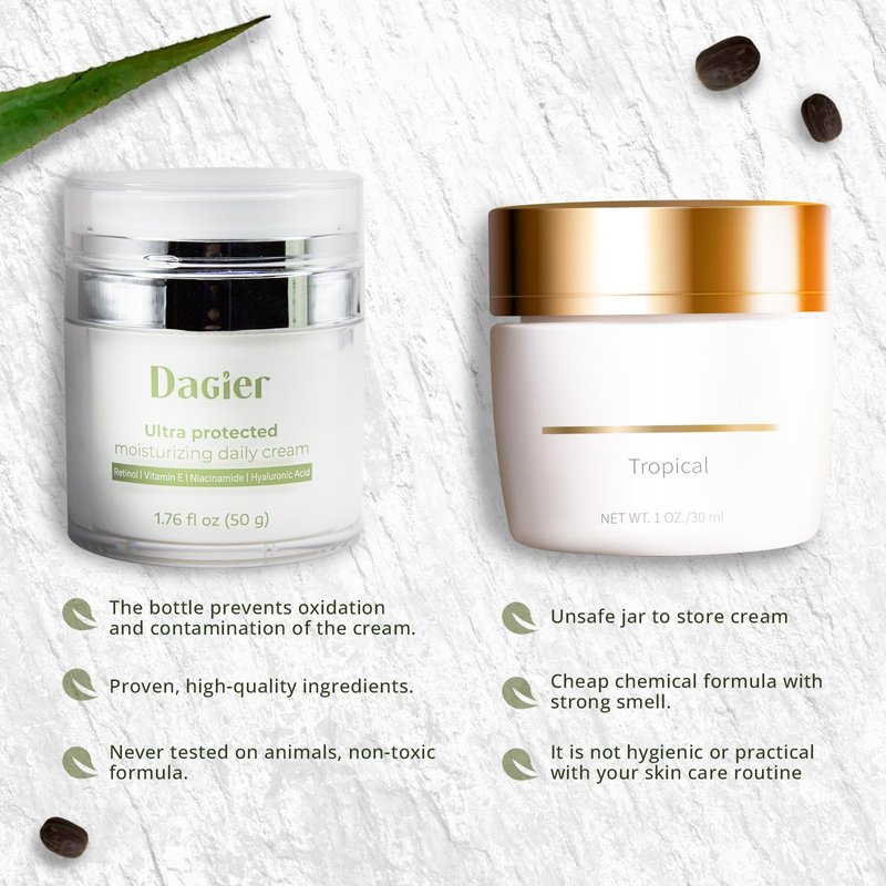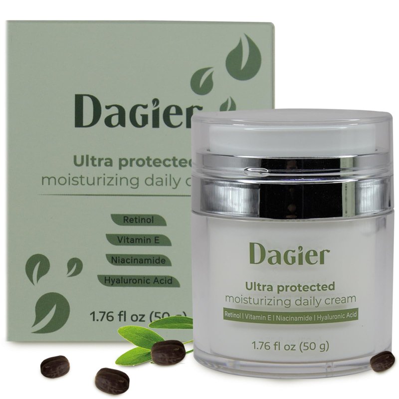 High-quality Dagier Ultra Protected Moisturizing Daily Cream with carefully selected ingredients provides a cream that addresses multiple aspects of skin care, offering hydration, antioxidant protection, anti-aging benefits and overall skin nutrition. A unisex product that works on any skin type and can be used day or night. Helping to reduce the signs of aging. With ingredients like retinol to improve skin texture and increase collagen production, vitamin E as a free radical fighter to protect skin, niacinamide to even skin tone and strengthen the moisture barrier, hyaluronic acid to hydrate deeply, and collagen to improve elasticity and firmness. This cream absorbs easily into the skin, leaving it looking fresh, soft and youthfully radiant. Formulated without parabens or synthetic fragrances. Regular use helps smooth the appearance of fine lines and wrinkles while providing intensive hydration to keep your complexion supple and healthy-looking. For clean, green skincare and healthy nutrition, Dagier Natural Moisturizing Cream is the way to go. Directions: Apply to cleanse in circular motions for best results every morning and evening. This cream contains RETINOL, so use SPF 30+ to protect your skin from direct sunlight during the day. Safety Information: Do a patch test to check your skin for allergies. For external use only. Avoid direct eye contact. Keep out of reach of children. Store at room temperature, keep away from children.