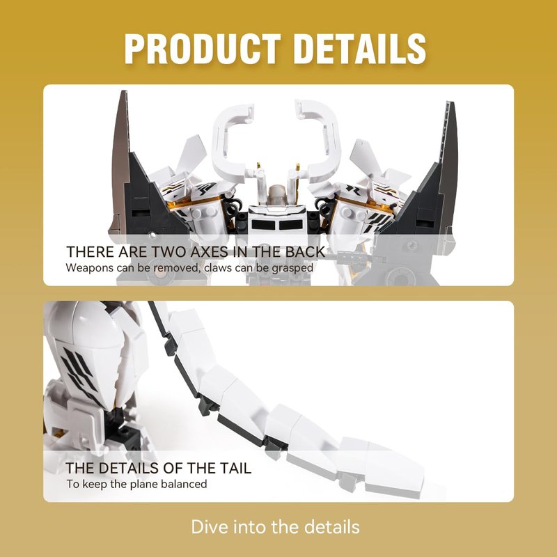 - Mech Building Model: The White Tiger mecha suit is inspired by mythological scenes. He carries a battle axe on his back, carries chest armor with a tiger head, and his sharp blades and claws are indestructible. His entire body is movable, adjustable arms, legs, and fingers can be transformed into various forms.