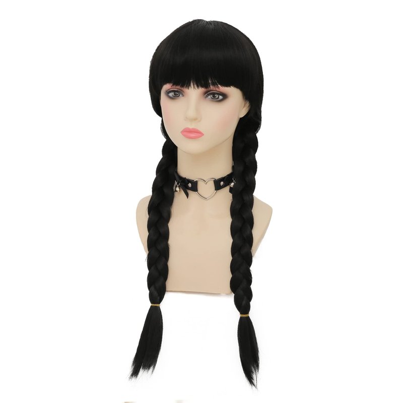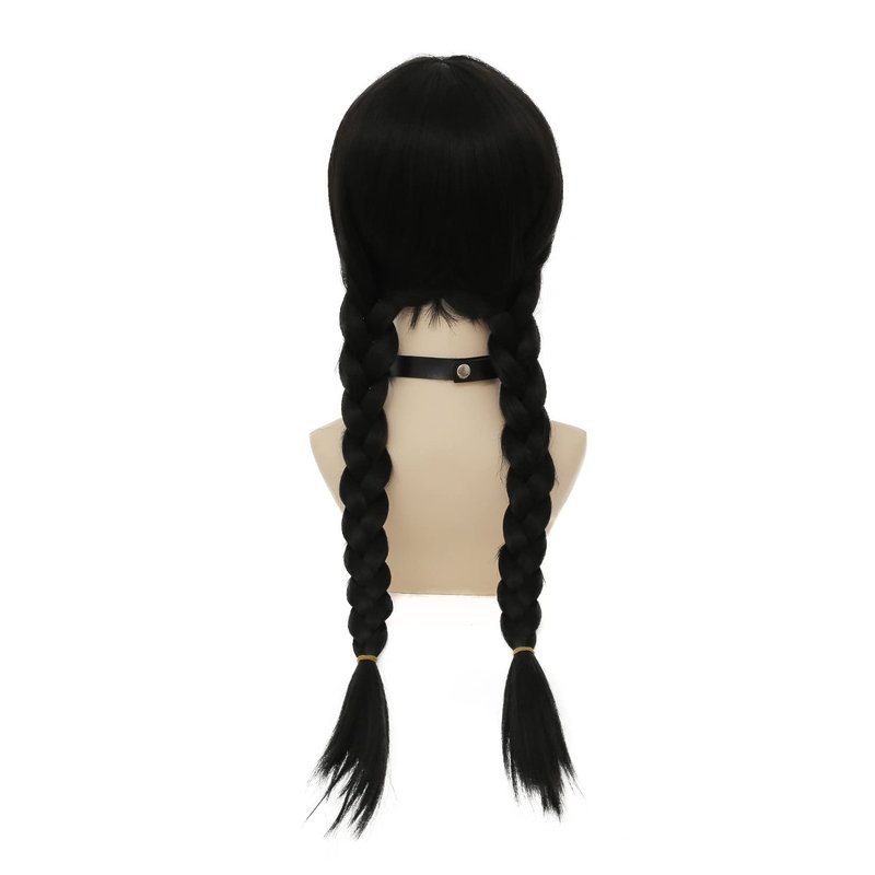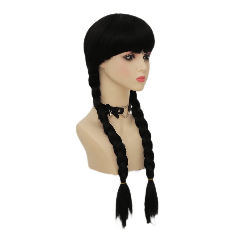 - This synthetic fiber wig features long black pigtails with center part and two braids, just like Wednesday wears her hair.