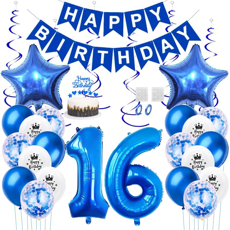 Daimay 16th Birthday Party Decorations Blue Happy Birthday Banner Flag Latex Confetti Balloons Number 16 Foil Balloon Star Mylar Balloons Cake Topper for Men Women Anniversary Party Supplies