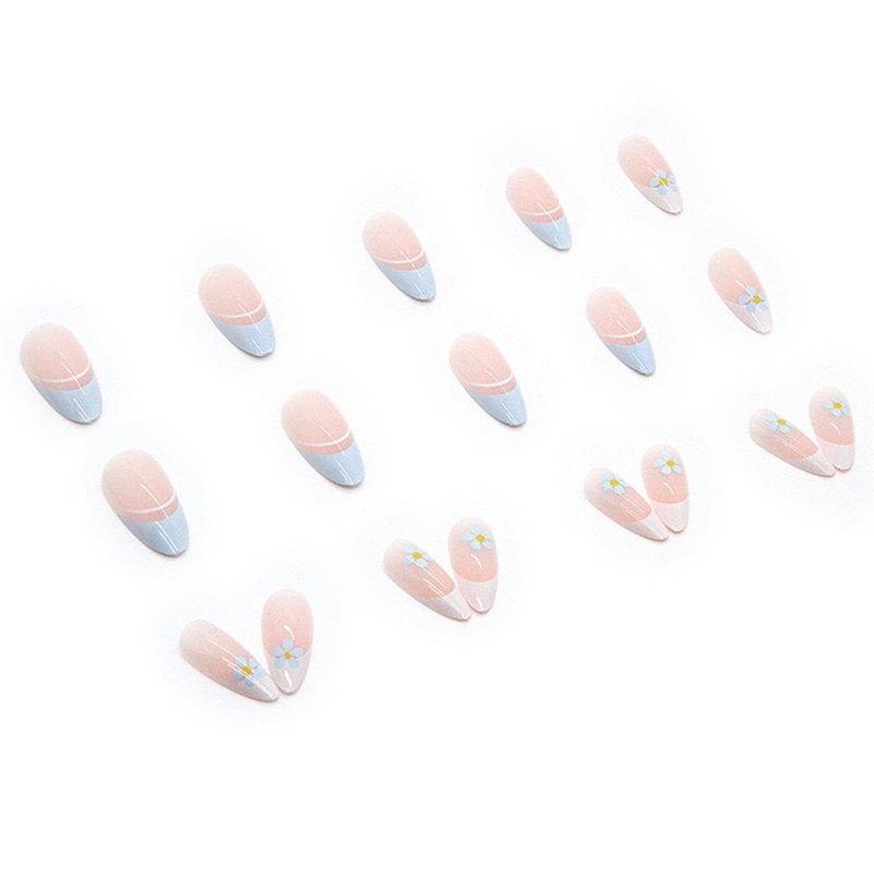 Daisy Press on Nails Medium Almond Fake Nails Full Cover White French tip False Nails with Design Flower Stick on Nails Spring Summer Light Blue Glue on Nails Acrylic Nails for Women Girls Manicure