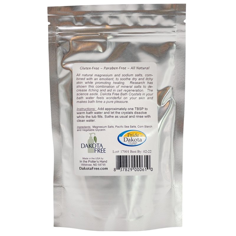 All-natural, unscented mineral bath salts to soothe skin while you bathe. Dakota Free Bath Crystals use magnesium and sodium salts, combined with an emollient, to soothe dry and itchy skin while promoting healing. Research has shown this combination of mineral salts to decrease itching and aid in cell regeneration. The science aside, Dakota Free Bath Crystals in your bath water feels wonderful on your skin and makes bath time a pure pleasure. Add to the bathtub while it's filling with warm water, giving the bath salt crystals time to dissolve. Rinse skin after bathing, pat dry and apply Dakota Free Moisturizer for optimal results. This refill packet refills one Dakota Free Bath Crystals 6 oz Tub. Product use tips: -Bring the spa into your home and pamper your skin every day with Dakota Free Bath Crystals. -Make a soothing foot soak with warm water and Dakota Free Bath Crystals. Use for tired, aching or itching feet. -Soak in a warm water bath with Dakota Free Bath Crystals added to help relieve sore muscles or itching skin. -Soaking in Dakota Free Bath Salts is an easy way to increase magnesium levels in your body. -This product is very relaxing, soak before bedtime to promote healthy sleep. Chemical free, home spa bath product. Ingredients: Magnesium salts, Pacific Ocean sodium salts, corn starch and vegetable glycerin (from palm ).