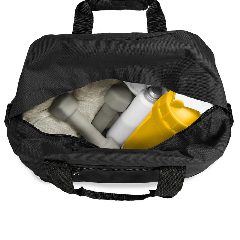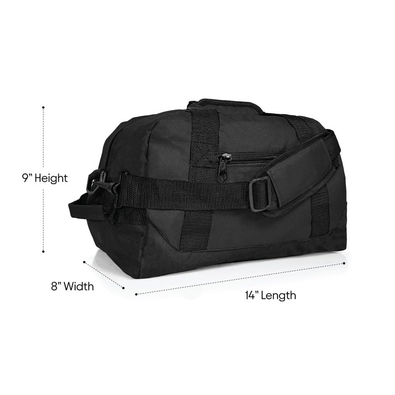 Dalix 14" Small Duffle Bag Two Toned Gym Travel Bag This versatile bag has it all, its lightweight, small and two toned in more color giving a vibrant feeling. Made for portability with its 14" sizing, you can bring this bag anywhere with you and not have to worry about making space for a bag. It also features a shoulder strap (with shoulder padding) for easy-carry purposes or handles with a handle clasp closure on top of the bag, and a front zipper compartment for smaller accessories such as keys, lotions, hand towels. Also, a smaller side handle is available for extra support.This bag is 14" long, perfect for airplane rides, travel, luggage, and gym use. Our bags come with 2 side carry handles which can be used to hang the duffle in a locker or at home for convenience. Our 14" Small Duffle Bags come in 13 different color options perfect for any occasion such as travel, sports, gym, hiking, carry-on, luggage and much more! Comes in Color: Black