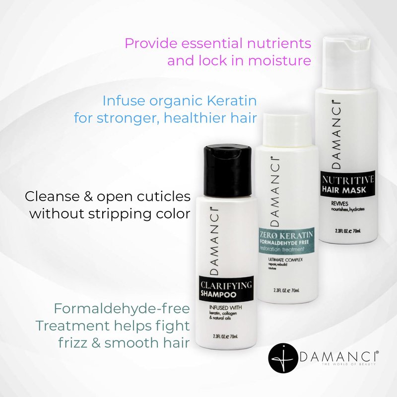 - 3-Step Hair Smoothing Treatment Kit- Clarifying Shampoo opens the hair cuticle for better absorption. An aminoacid-based keratin treatment hydrates and repairs damaged hair. Nutritive Hair Mask locks in nutrients for increased smoothing effect.