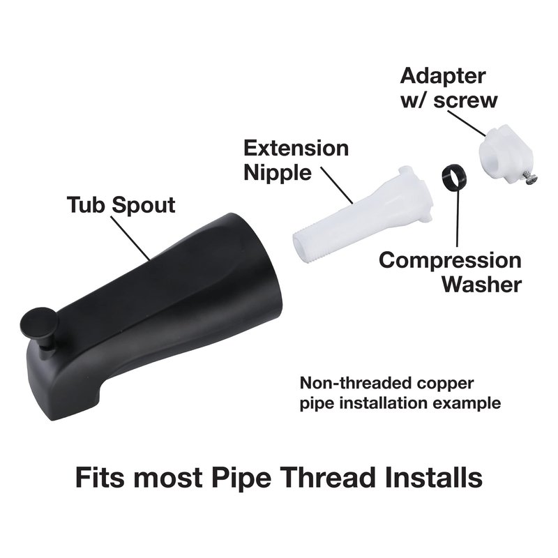 - CONNECTION SIZE: This diverter tub spout is compatible with 1/2 inch copper pipe slip-fit connections, 1/2 inch male threaded connections, 1/2 inch male pipe connection w/threaded end, and 3/4 inch male threaded connection
