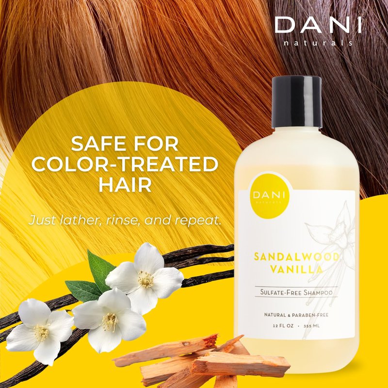DANI Naturals Sulfate Free Sandalwood Vanilla Shampoo is incredibly gentle, and designed for daily use. Our pure, coconut-derived cleansers are low sudsing and rinse away cleanly, while organic aloe vera and allantoin work to moisturize hair and soothe dry scalp. This natural formula is pH balanced and safe for color treated hair. DANI creates all our scents using custom essential oil blends, for the best smelling fragrances available. Our sandalwood vanilla shampoo is a wonderful warm and woodsy fragrance, perfect for men and women.