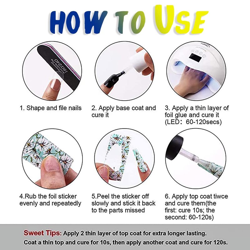 - Easy to Use -- Apply the foil glue and wait for 5 min (make sure the foil glue turns clear); cut a piece of the nail decals and press it on your nail; peel the backing off and the sticker will transfer on your nail,you will find that your nails are getting charming and attractive. It can be used for regular polish and UV gel polish.