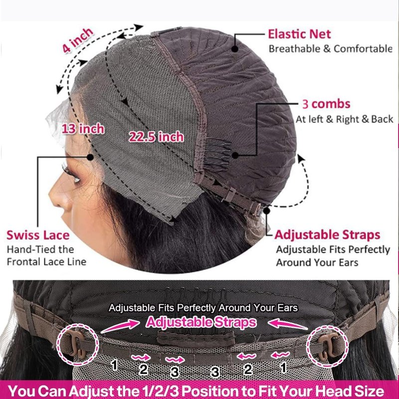 - 🌺Glueless Lace Front Wigs Cap Size:13x4 Ear to Ear HD Transparent Lace Frontal Wig, Bleached Knots And Pre plucked With Natural Hairline , Offer You Very Natural Hairline Than closure wig ,4Inch Parting Space, Can Make High Ponytail&Bun. Medium Cap Size 22-22.5 inch with Adjustable Strap, Elastic Bands and Combs Attachedand Combs, Fit All Heads.