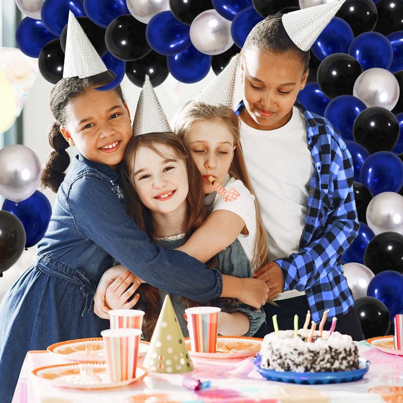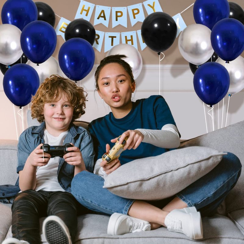 - Navy Royal Blue, Black, Metallic Silver Balloons Garland : You will get 117pieces video gaming birthday party decorations kit, 12inch 10inch 5inch black balloons 45 pieces, 12inch 10inch 5inch navy blue balloons 45 pieces, metallic silver balloons 25pieces, 16ft of balloon tape strip 1, 100 dots balloon glue, great to make balloon arch fot your love boy's birthday party decorations.