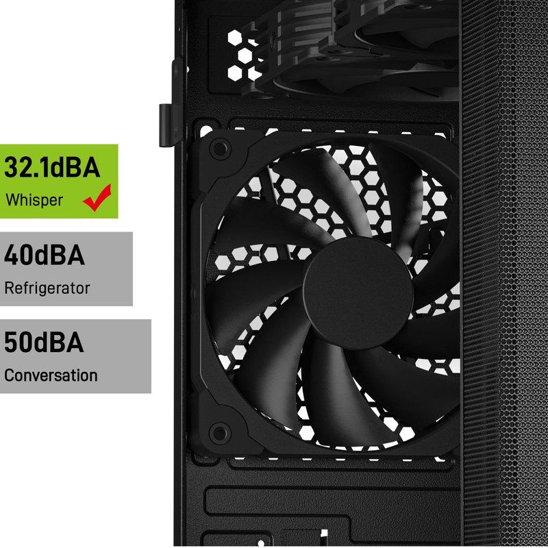 - Low Noise: Every fans are equipped by four soft silicone cushions that can absorb vibration at high speeds. The maximum noise is only 32.1dBA. Keep the case in a relatively quiet environment when working.