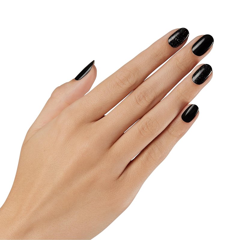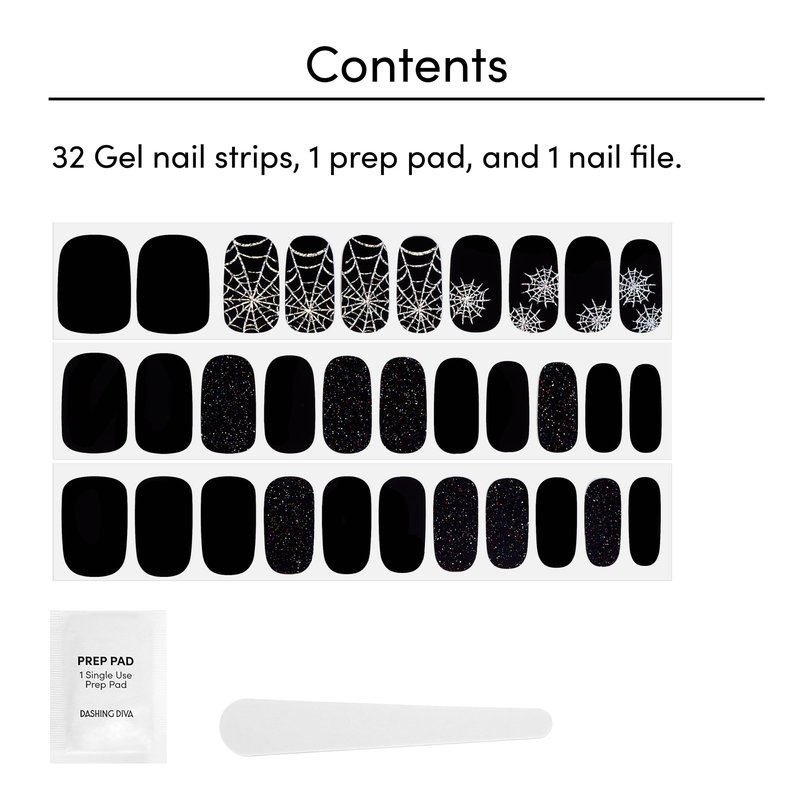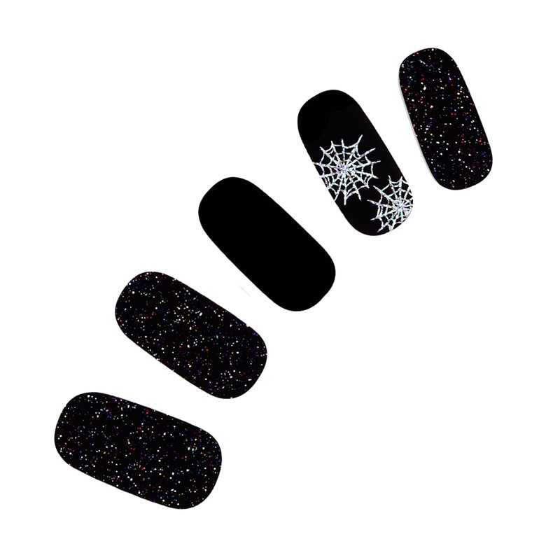 - TANGLED UP: Black gel nail strips featuring iridescent spiderwebs and iridescent glitter with a glossy, high-shine finish.