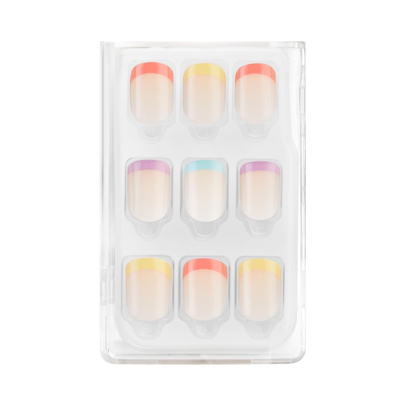 Short length, square shape, glossy finish light nude press-on gel nails featuring multicolor French tips. INCLUDES: 30 gel nails in 12 sizes, 1 prep pad, 1 nail file, 1 wooden manicure stick