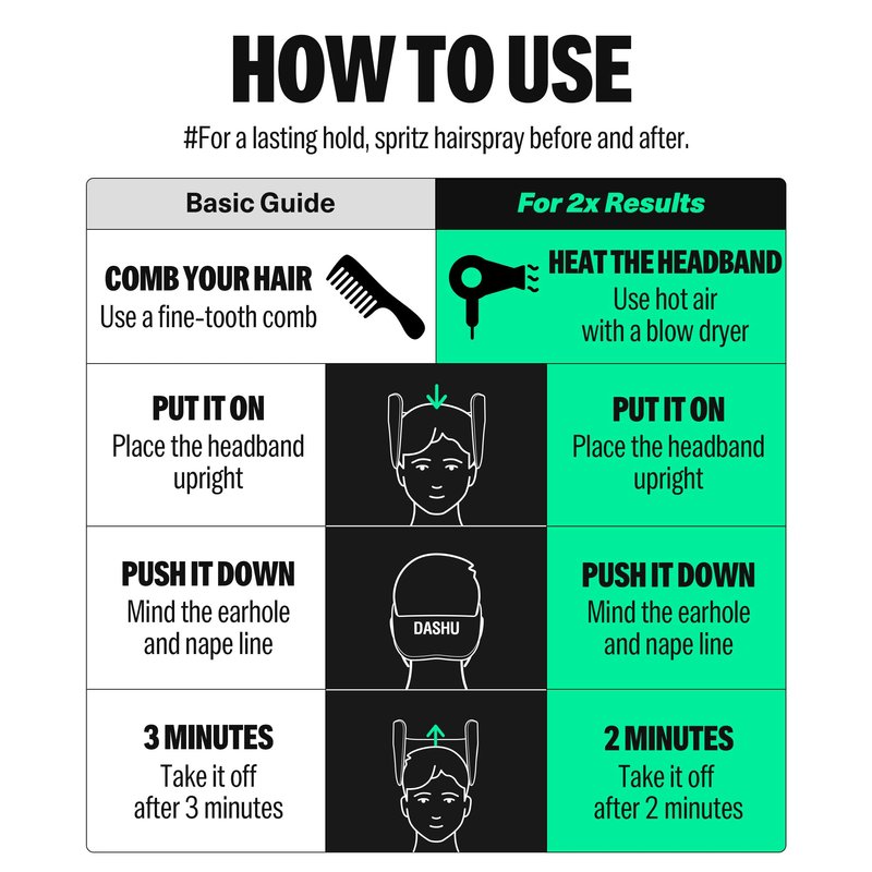 - HOW TO USE. For a stronger hold, blow dry with hot air to heat the headband then wear it for 2 minutes. For casual hold, simple place and adjust the headband minding back hair and side parts then wait for 3 minutes. Say goodbye to unruly side hair and enjoy a perfectly pressed-down side and back hair for a lasting sleek look!