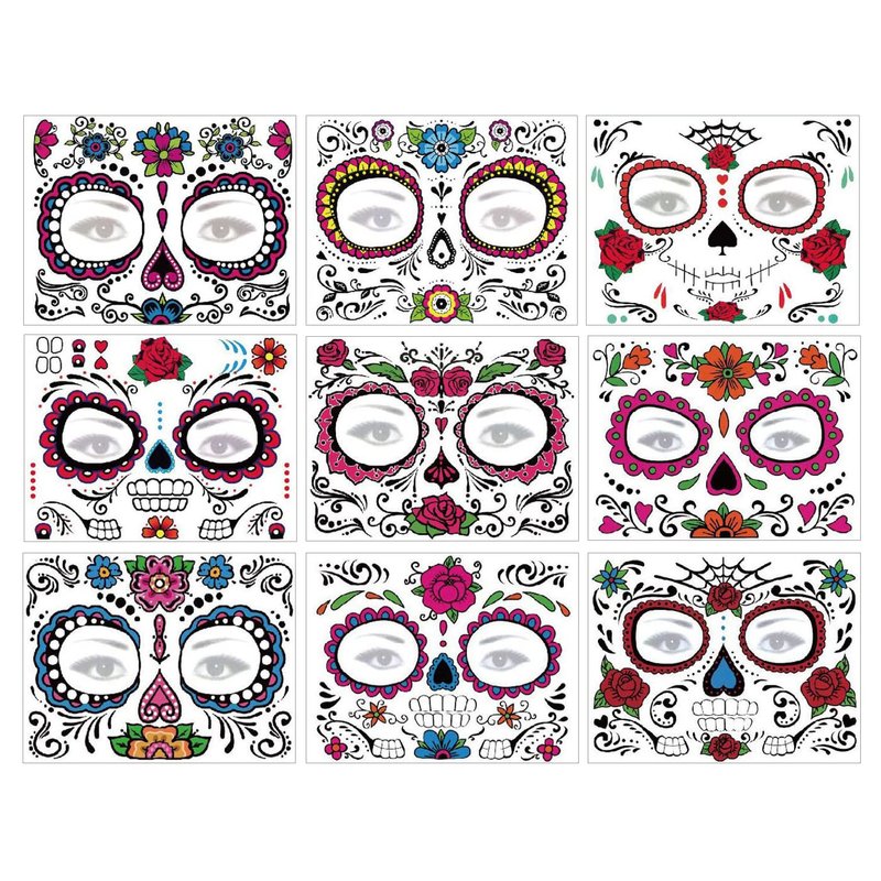 Day of Dead Face Tattoos, 6-Sheet Sugar Skull Tattoos Temporary Stickers and 3-Sheet Fake Floral Black Skeleton Web Full Face Mask Tattoo for Women Girls Kids Holloween Face Makeup