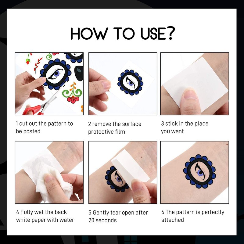 • NO HARM TO SKIN & WATERPROOF - Includes 10 sheets sugar skull full face tattoo. These colorful face stickers are made of eco- friendly materials and Non-toxic, phthalate free,harmless and safe for your face. 100% waterproof and sweat-proof, tattoo may last for 3-5 days.