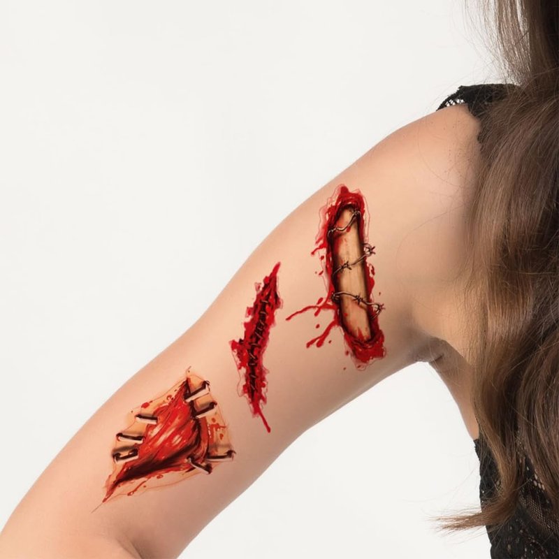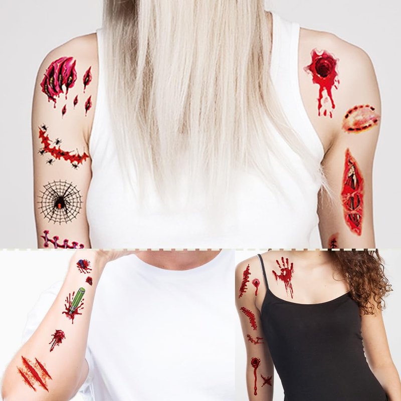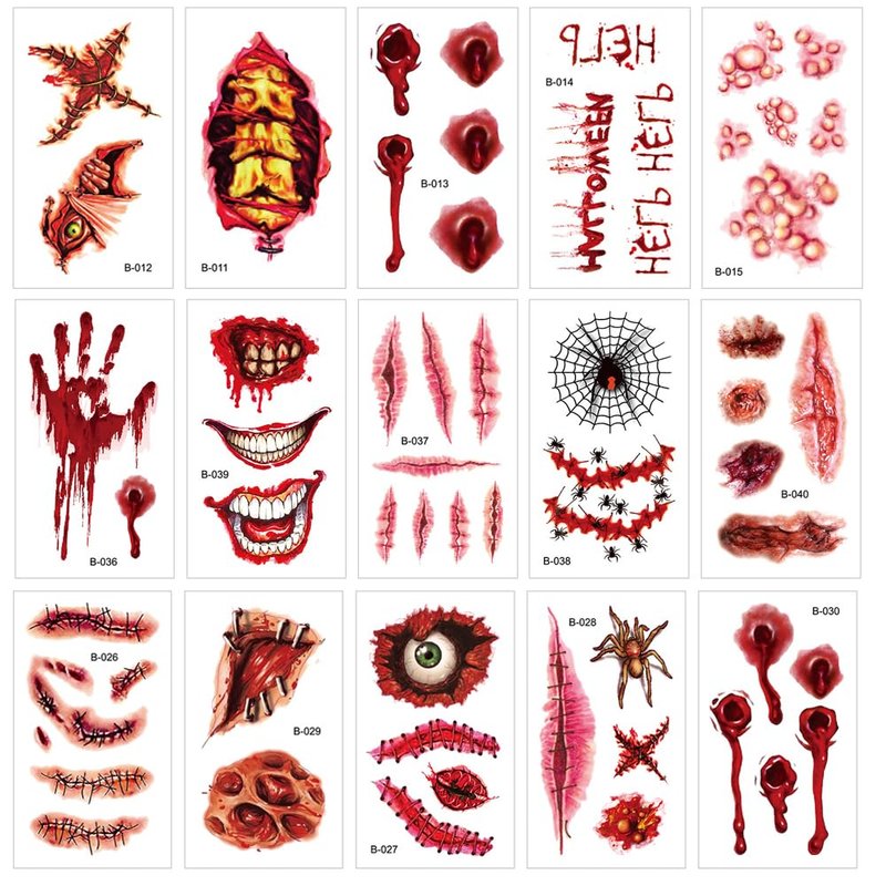 - Halloween temporary tattoos, realistic scar, horror blood wound, Zombie teeth, Ghost eyes, spiders, spider web, etc. Scary tattoo stickers for Halloween art decor