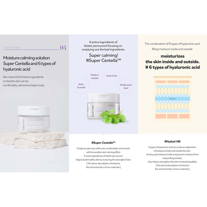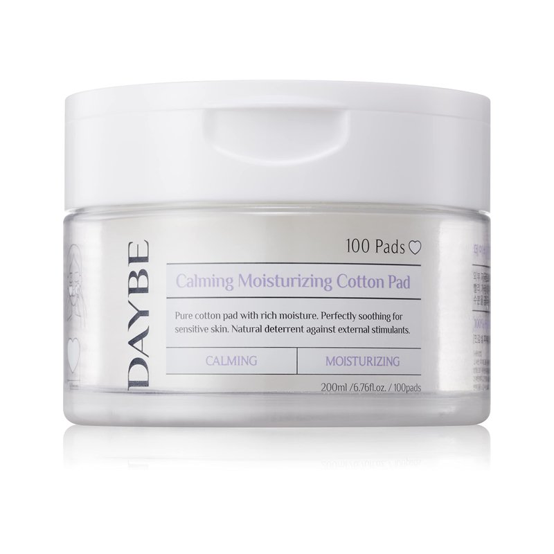 DAYBE Calming Moisturizing Cotton Pad 100pads/200mlLast step of cleaning! First step of basic care!Start now with DAYBE Toner Pad,Washing your face is not enough for a deep cleansing.DAYBE Toner Pad helps to soothe the skin texture and give moisture to the face. DAYBE Toner Pad, with qualified in 6 real application tests! - Skin moisture barrier (outer skin) improved by 121.79% - 2.5cm deep skin moisturizing (inner skin) improved by 101.64% - Skin epidermal water loss improved by 105.22% - Skin soothing effect improved by 104.10% - Skin texture improved by 105.43% - Completed hypoallergenic test for sensitive skin Fill every gap with DAYBE Heart Pads - 80mm large heart-shaped pads can tightly fill the gaps of the face. - Perfect for use under the eyes and hard to reach troubled area.- Hold the pads between your fingers for deep cleansing. Made with OEKO-TEX STANDARD 100, Product class 1 Cotton- Certified as eco-friendly by OEKO-TEX.- DAYBE Toner pad uses only the best cotton.- No Fluorescent brightener.Moisture Soothing Solution with Super Centella and 6 Hyaluronic Acids- Filled with active ingredients to keep the skin moist and soothe.- 4 active ingredients of Centella asiatica with excellent soothing effect # Super Centella (Asiaticoside + Madecassoside + Asian Acid + Madecassic Acid)- Helps the skin smoothing and make a healthy skin.- Moisturizes the skin #6 hyaluronic acids- 6 hyaluronic acids fill the skin with moisture.- Helps reduce moist from evaporating and strengthen the skin layer.The above description is limited to the ingredients characteristics*- Weakly acidic pH5.5 + EWG Green + No Fragrance- Protects healthy skin layer with acidic level of pH 5.5~6.0- Helps to maintain a good skin acidic level.- Uses only EWG Green ingredients. -Very safe with no harmful substance.