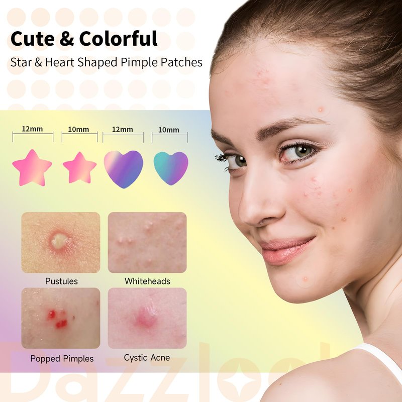 - FASHIONABLE COLORS & SHAPES | VALUED LARGE PACK: Each pack contains 48 star-shaped patches and 48 heart-shaped patches, providing you with an ample supply to tackle any breakout situation that arises. The iridescent colors are unique dazzling pink and blue, shining under indoor & outdoor lights. Very fantastic and great value for your money!