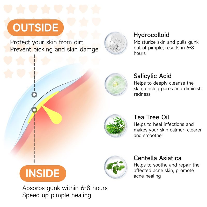 - NATURAL & POWERFUL INGREDIENTS | VEGAN & CRUELTY-FREE: The cute star heart pimple patches create an ideal moist environment for faster pimple recovery without drying out the surrounding skin. Adding salicylic acid, tea tree oil and centella asiatica help calm, soothe, pore-tighten and repair the affected skin. It can absorb pimple gunk in 6-8 Hours and speed up the acne elimination process. We guarantee no animal-derived ingredients, no animal testing.