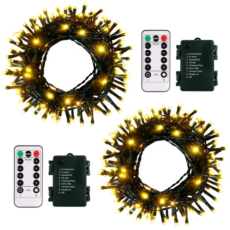 - Remote Control & 8 Modes: The outdoor battery operated Christmas string lights with remote control to modify 8 lighting patterns, set the timer and adjust brightness as well as turn them on and off, simply press the button on the battery box to select 8 lighting setting from combination, in wave, sequential, slo glo, chasing/flash, slow fade, twinkle/flash to steady on.
