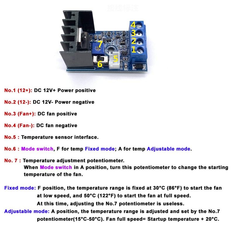 - This DC12V governor can be controlled according to the ambient temperature of the fan speed, no manual control, automatic stepless speed, the higher the ambient temperature, the faster the fan speed control, saving energy and reducing noise.