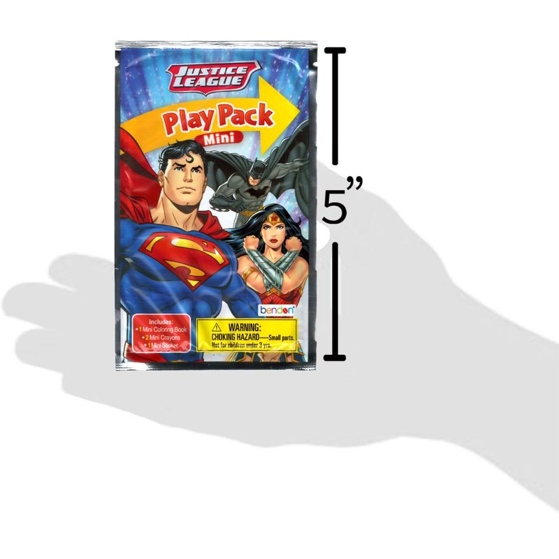 - This Justice Leage party supplies set features 24 mini Grab n Go Play Packs which each include a miniature coloring book, stickers, and coloring utensils.