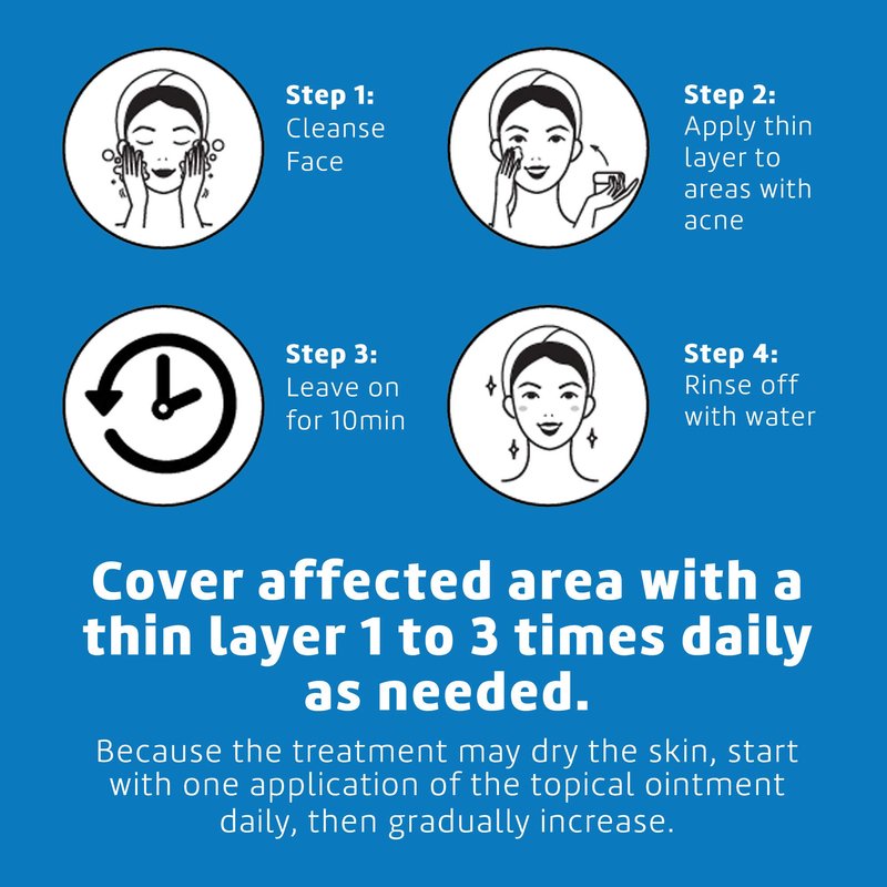 - 10 MINUTE ACNE TREATMENT Apply a thin layer over your face, back or the affected area, wait 10 minutes and wash off with warm water. A consistent daily regimen will ensure the best results.