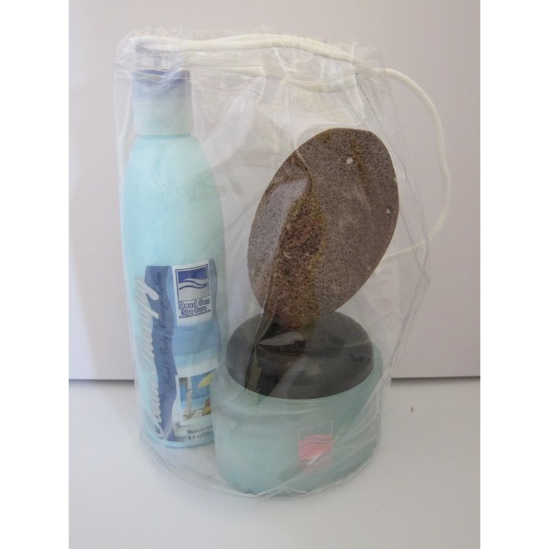 Seekers of natural beauty and skin care have been drawn to the power of the Dead Sea and the vitality of its minerals for hundreds of years. This Spa Care gift set includes: 8 oz Bottle of Hand and Body Massage Lotion, 10 oz jar of Dead Sea Salt Scrub and a Pumice stone.