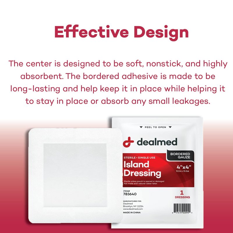 - Sterile Dressings: The Dealmed Island Dressings make wound care completely hassle free and easy to do, much more so than regular gauze and tape. The adhesive borders help it to stay in place, absorb leakages, and protect the affected area.