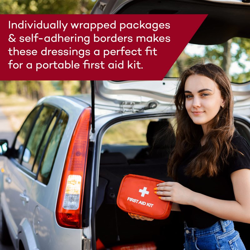 The Dealmed Island Dressing bandages are self-adhesive, non-stick bandages, perfect for administering first aid, first response, and ambulatory treatment of wounds. They are an essential addition to every classroom, office, and home first aid kit. The 25 dressings are 4" x 4" with a flexible adhesive border which adequately covers large, deep wounds for optimal protection. Each wound bandage comes individually wrapped in its own package to ensure cleanliness and further protect against possible infection. These incredibly strong and breathable adhesive gauze pads will assure that no matter what you're doing, they will move with you to provide incredible coverage and protection.