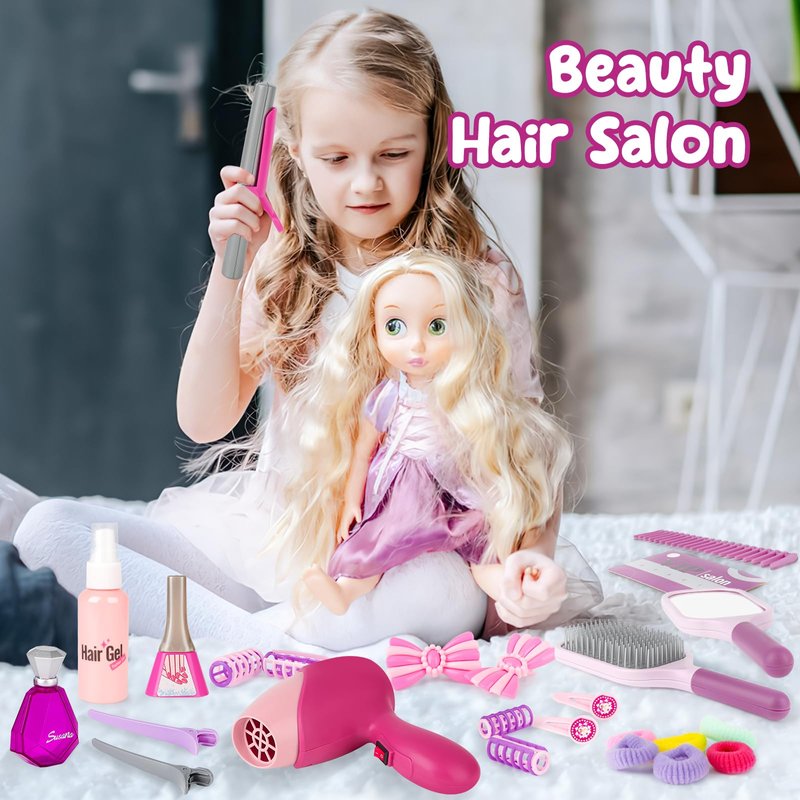 - [Learning Through Play] Brightly coloured and beautifully designed hair styling toys for girls bring your princess a realistic barber role-play experience.Girls can pretend to style their own hair with the curly hair hairdressing set toys and have hours of fun using the comb to play hairdressing salon games - combing and styling dolls' hair.