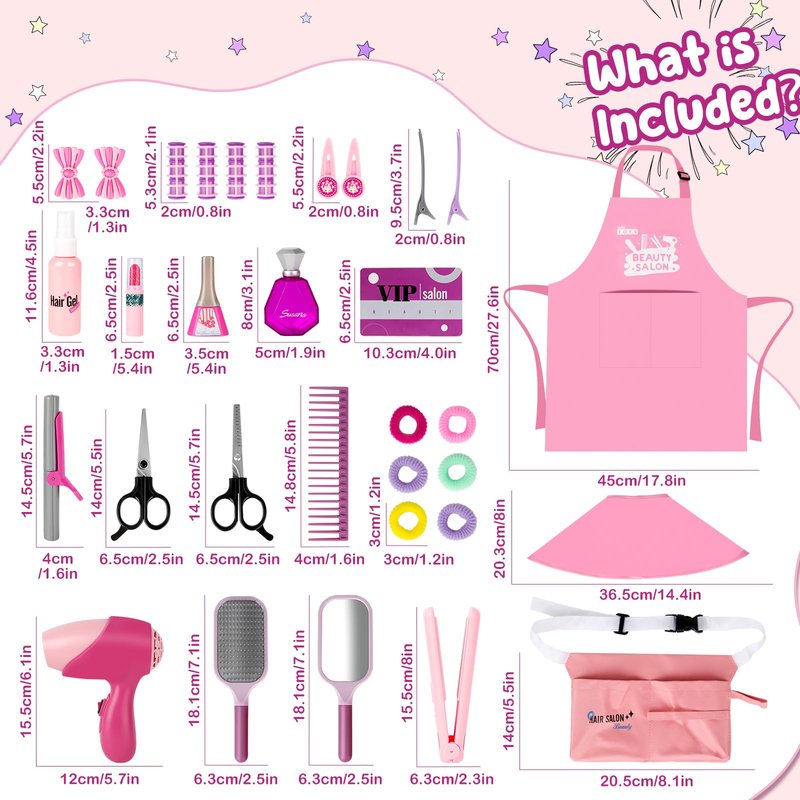 - [Girls Hair Salon Toys] deAO beauty salon toys includes shawl, tool bag, hair stylist apron, hair dryer, straightener, curler, scissors, clippers, comb, mirror, hairspray, hair clips, VIP card, perfume bottle and more.
