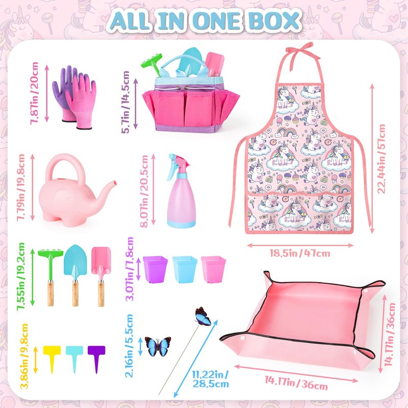- Kids Garden Toys - This kids gardening tool set contains 1 apron, 3 shovel tools, 1 water bottle, 1 floor mat, 1 handbag, 1 watering bottle, 3 plant pots, 3 labels, 12 PCS butterfly flower arrangement, and a pair of gardening gloves to protect their little hands.