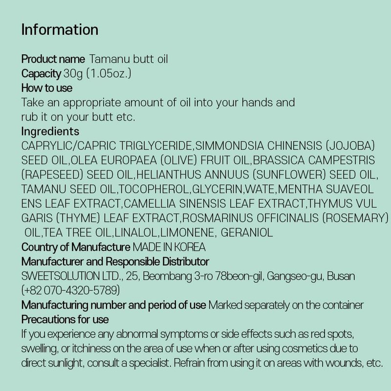 It gives you comfort during a stressful day with unspeakable worries. The first step to anal health, like skin care, anal care is essential. The unspeakable concerns of modern people increase every year. Whether you are an office worker who sits every day, a student who studies for long hours, or a pregnant woman about to give birth, don't neglect it anymore and take care of it with Dear Aria Tamanu soothing buttock oil! Dear Aria Tamanu soothing buttock oil will heal your precious and angry skin. Red and angry places, take them in with natural oil. Made with 99.9% safe and naturally derived ingredients. Good ingredients that soothe the skin, use with confidence.