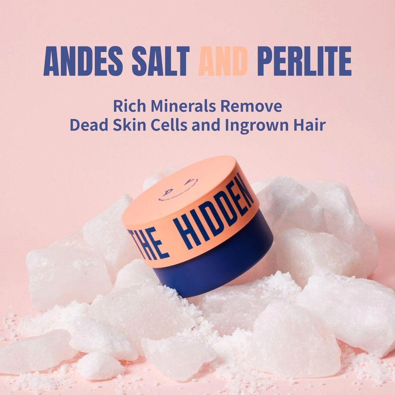 - 🔵 The Hidden Body Scrub | Smoothing: The 2-in-1 body cleanser & scrub, with plant-derived ingredients, creates a rich lather to cleanse all over body. Fine Perlite from volcanic rocks and coares Andes salt exfoliate dead skin cells with the tranquil scent.
