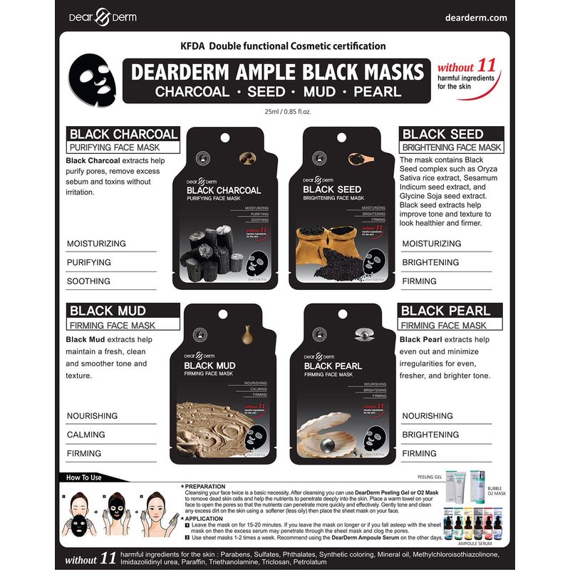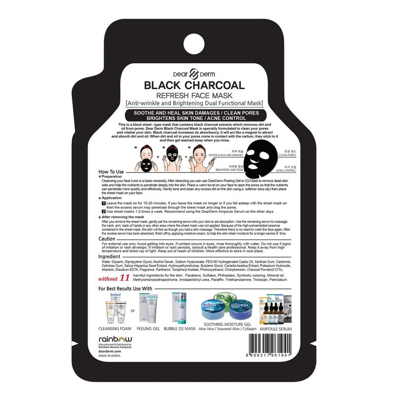 - This is a black sheet –type mask that contains black charcoal extracts which removes dirt and oil from pores. Dear Derm Black Charcoal Mask is specially formulated to clean your pores and vitalize your skin.