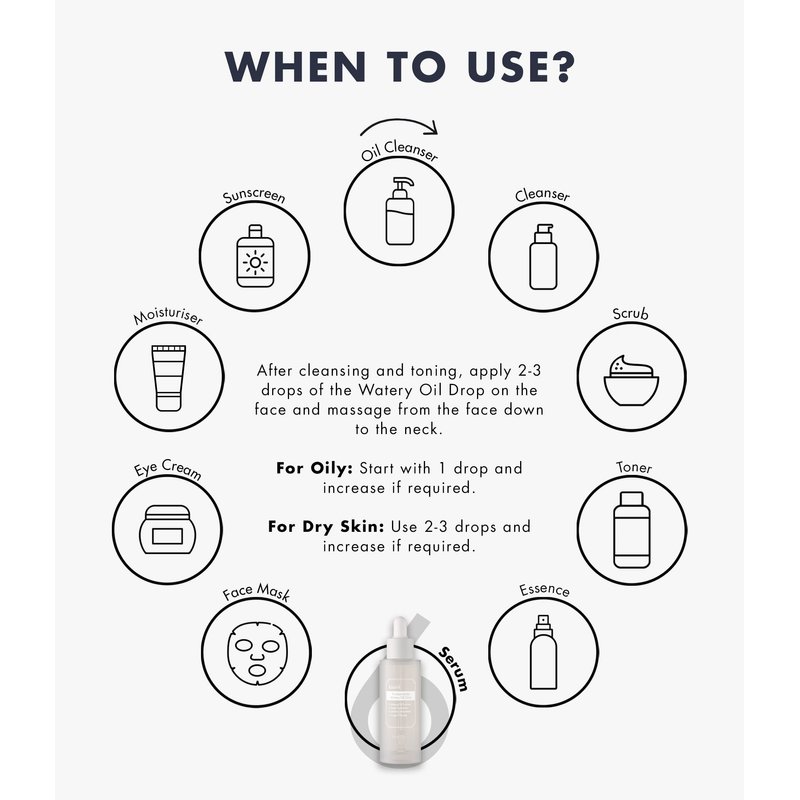 - After cleansing and toning, apply 2-3 drops of the Watery Oil Drop on to the face and massage throughout the entire face down to the neck.