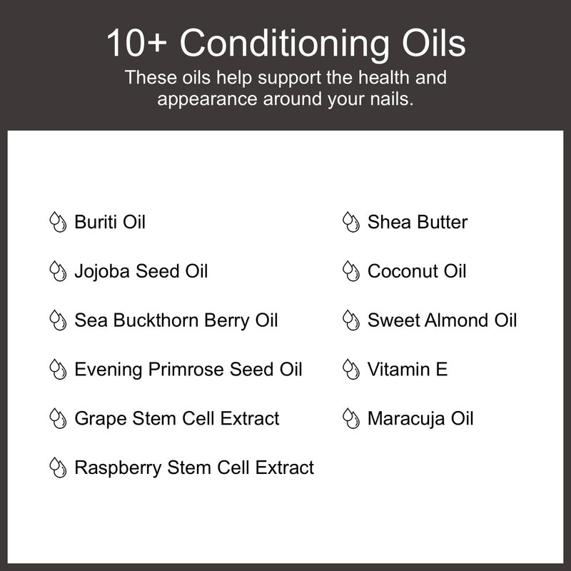 - MOISTURIZING INGREDIENTS: Support the health and appearance around your nails with these 10+ conditioning oils: buriti oil, coconut oil, maracuja oil, jojoba seed oil, sea buckthorn berry oil, evening primrose seed oil, raspberry stem cell extract, grape stem cell extract, sweet almond oil, vitamin E, and shea butter.