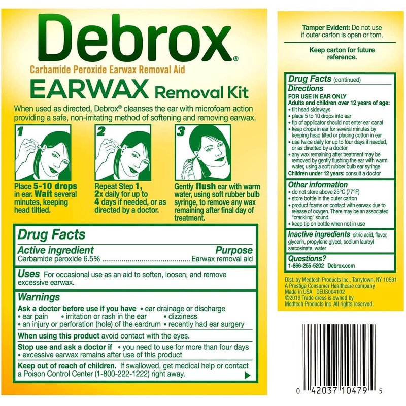 Debrox Earwax Removal Kit includes a soft rubber bulb syringe to rinse your ear after using Debrox Earwax Removal Drops. Excessive earwax build-up can lead to ear discomfort and reduced hearing, which can affect your day-to-day life. Debrox Earwax Removal Drops are a safe and inexpensive in-home solution. Debrox's gentle, non-irritating microfoam cleansing action goes to work to soften and loosen earwax. When drops are placed in the ear, oxygen is released. This release allows Debrox to foam on contact as it gently softens and loosens earwax. Once broken down, earwax is able to drain from the ear and ears are relieved of built-up earwax so you can return back to daily life without muffled hearing caused by excess earwax. Trust Debrox to help keep your ears – and hearing – clear.