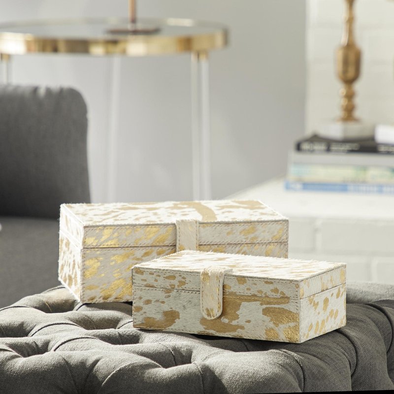 - GOLD AND WHITE GIFT BOXES: Rectangle decorative storage box set showcases a chic gold and white cow print leather hide with a textured hair finish and upholstered stitching
