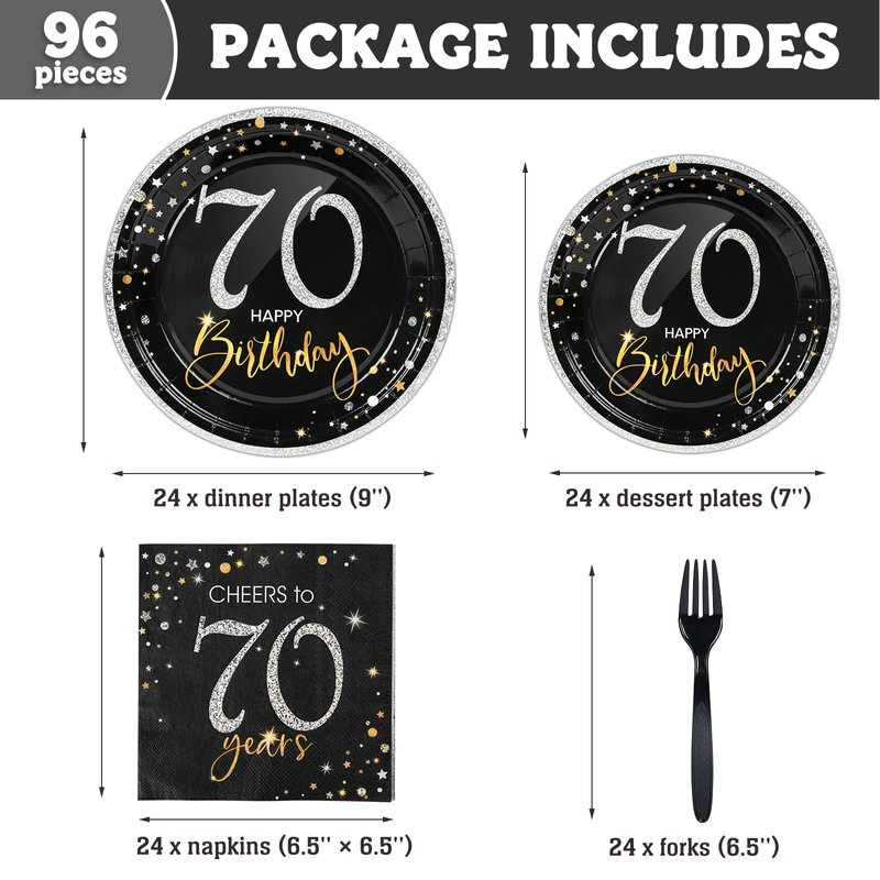 - 【Complete Party Set】 Simplify party planning with our comprehensive set designed for 24 guests, including 24 black and gold dinner plates (9''), 24 dessert plates (7''), 24 napkins (13''), and 24 forks (6.5''). Hosting your 70th birthday celebration has never been easier!