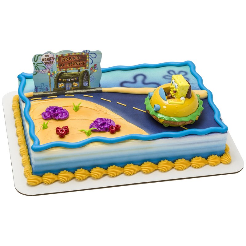 - SpongeBob Cake Decorations - SpongeBob SquarePants rolls up to the Krusty Krab in his very own Krabby Patty car that features wheels that roll and poly pick backdrop