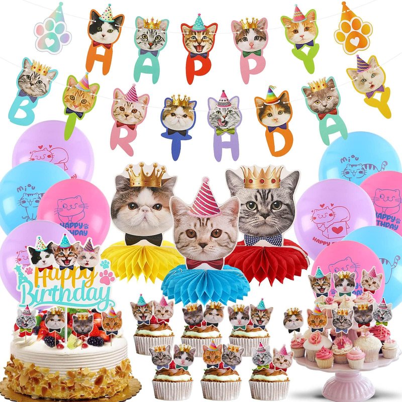 • Value Birthday Decorations Set: Cat birthday party supplies include 2 pcs cat birthday banner 3 pcs cat birthday honeycomb 9pcs cat birthday balloons 1 pc big cat cake topper and 24 pcs small cat cupcake toppers for cat decor