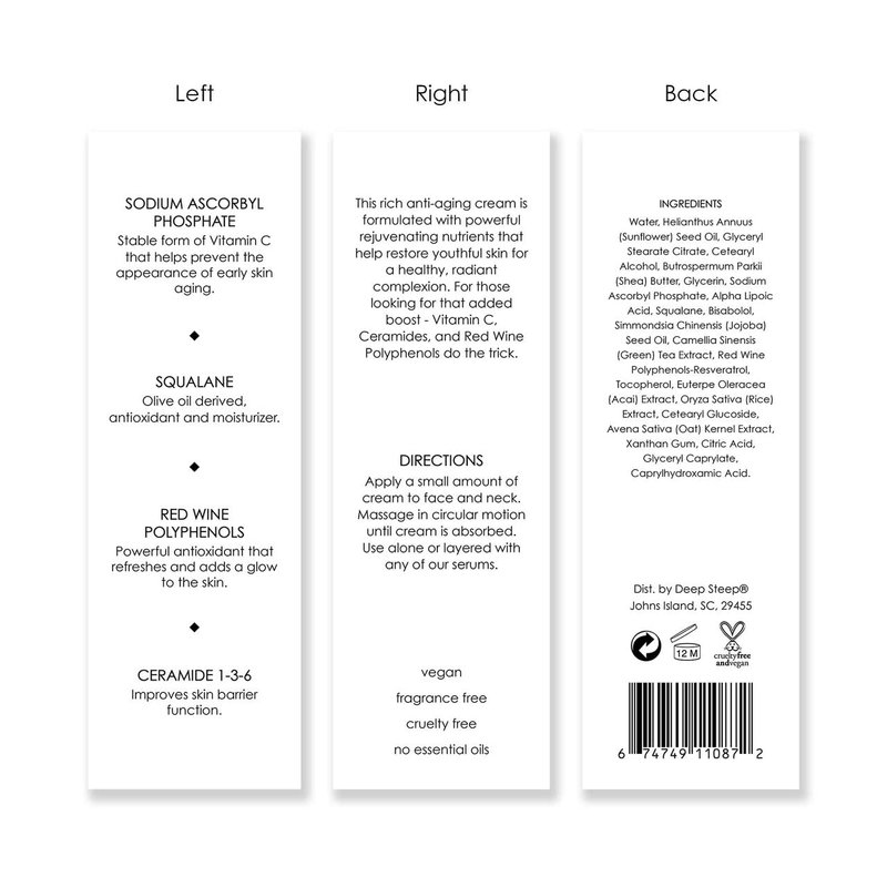 What it is: This rich anti-aging cream is formulated with powerful rejuvenating nutrients that help restore youthful skin for a healthy radiant complexion. For those looking for that added boost, Vitamin C, Ceramides, and Red Wine Polyphenols do the trick. Skin Type: All skin types (aging skin, problem skin). Skincare Concerns: Anti-aging, fine lines/wrinkles, dryness, loss of elasticity/firmness, dullness. Formulation: Cream. Highlighted Ingredients: Red Wine Polyphenols-Resveratrol: Powerful antioxidant that refreshes adds a glow to skin. Sodium Ascorbyl Phosphate: Stable form of Vitamin C. Squalene: Olive Oil derived, antioxidant and moisturizer. Ceramide 1-3-6: Improves skin barrier function. Directions: Apply a small amount of cream to face and neck skin. Massage in circular motions until cream is absorbed. Use in morning alone or layered with our serums. Ingredient Callouts: This product is vegan, fragrance-free, cruelty-free, gluten-free, and comes in sustainable glass packaging.