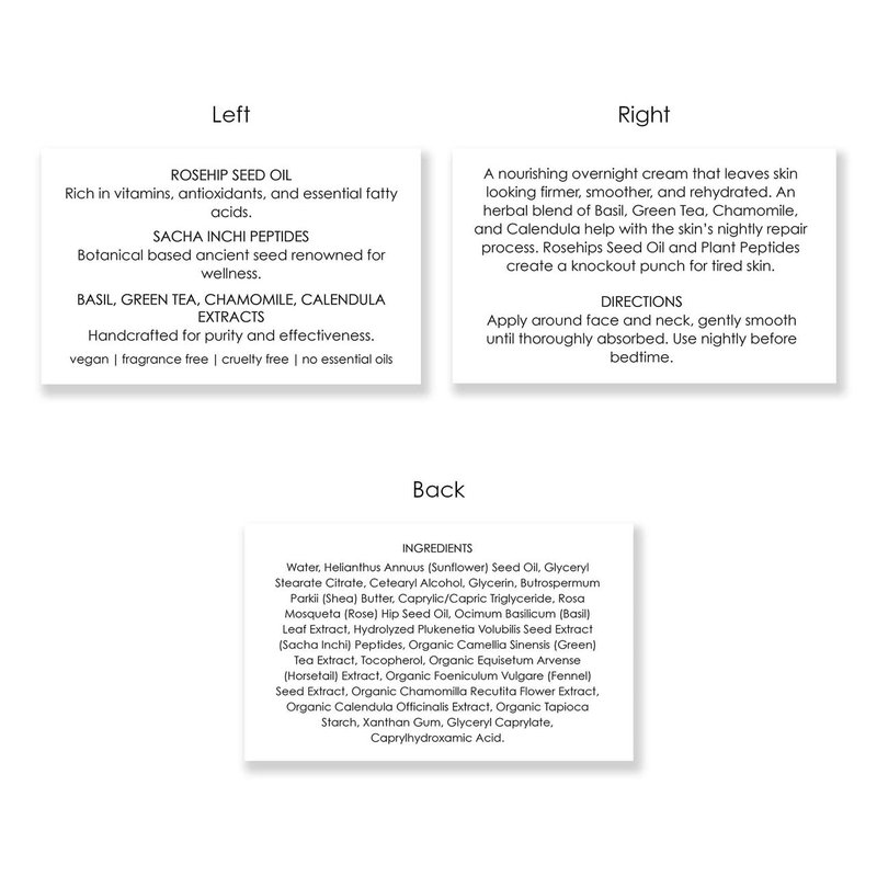 What it is: A nourishing overnight cream that leaves skin looking firmer, smoother, and rehydrated. An herbal blend of basil, green tea, chamomile, and calendula help with the skin's nightly repair process. Rosehip seed oil and vegetable peptides create a knockout punch for tired skin. Skin Type: All skin types (aging skin, problem skin). Skincare Concerns: Dryness, anti-aging, loss of firmness/elasticity, dullness. Formulation: Cream. Highlighted Ingredients: Rosehip Seed Oil: Rich in vitamins, antioxidants, and essential fatty acids. Basil, Green Tea, Chamomile, Calendula Extracts: Handcrafted for purity and effectiveness. Sacha Inchi Peptides: Botanical based ancient seed renowned for wellness. Directions: Apply around the face and neck gently smooth until thoroughly absorbed. Use nightly before bedtime. Ingredient Callouts: This product is vegan, fragrance-free, cruelty-free, gluten-free, and comes in sustainable glass packaging.