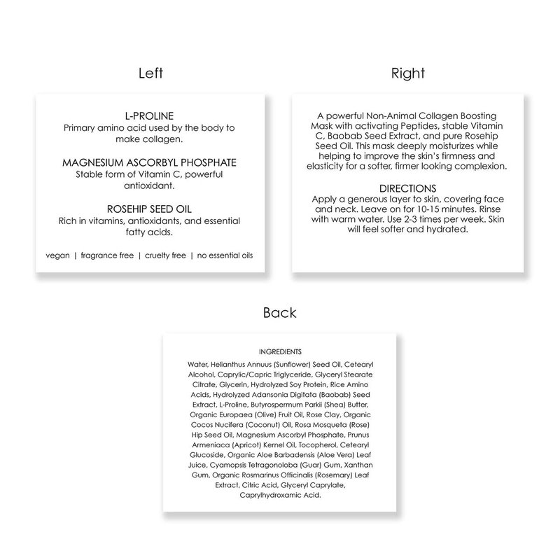What it is: A powerful Non-Animal Collagen Boosting Mask with activating peptides, stable Vitamin C, Baobab Seed Extract, and pure Rosehip Seed Oil. This mask deep moisturizes while helping to improve the skin’s firmness and elasticity for a softer, firmer looking complexion. Skin Type: Dry skin, mature skin. Skincare Concerns: Dryness, dullness, loss of firmness/elasticity, uneven texture. Formulation: Creamy pink mask. Highlighted Ingredients: L-Proline: Primary amino acid used by the body to make collagen. Magnesium Ascorbyl Phosphate: Stable form of Vitamin C, powerful antioxidant. Rosehip Seed Oil: Rich in vitamins, antioxidants, and essential fatty acids. Directions: Apply a generous layer to skin, covering face and neck. Leave on for 10-15 minutes. Rinse with warm water. Use 2-3 times per week. Skin will feel softer and hydrated. Ingredient Callouts: This product is vegan, fragrance-free, cruelty-free, gluten-free, and comes in sustainable glass packaging.