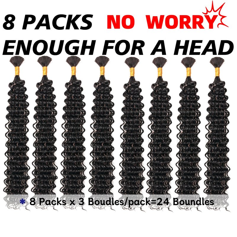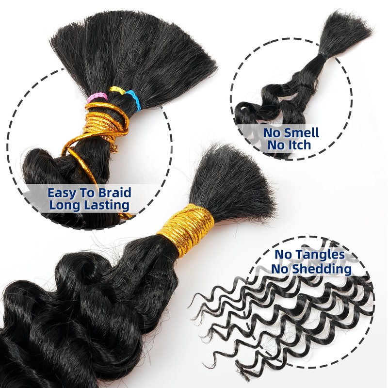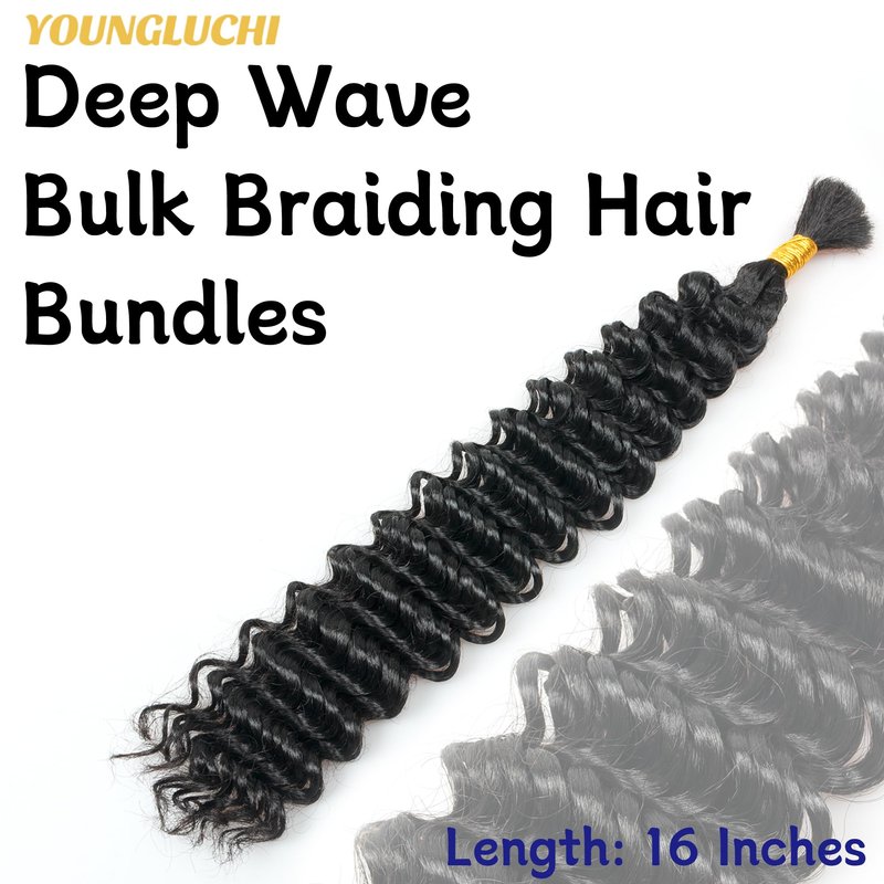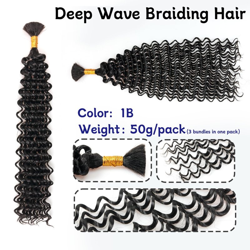 Product Name: Deep Wave Bulk Braiding Hair Extensions Color:1B(Natutal Black),#4(Light Brown),#27(Blonde),#30(Brown),#613(Off-white),TBUG( Burgundy).#350(ginger) Size:14 Inch,16 Inch,18Inch,20 Inch,22 Inch,24Inch,26 Inch,28 Inch,30Inch Weight:51g/pack DIY:Do it yourself.Many colors and sizes for your choice. Enables you to weave your own beauty. Type:Two packs,Eight packs. Product Benefits:Feather Feeling, Soft,Fluffy,Loose,Natural Looking,Long Lasting,Easy To Install;No Smell,No Tangle,Not Itchy, No Chemical,No Hurt Finger.