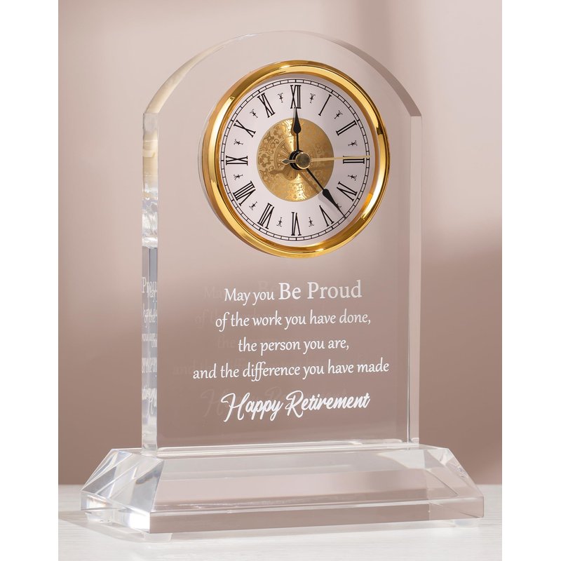- CELEBRATE A REMARKABLE JOURNEY: Our exquisite retirement clock is more than just a timepiece; it's a celebration of a remarkable journey. Crafted with premium acrylic and adorned with a clear UV-printed message, "May you Be Proud of the work you have done, the person you are, and the difference you have made Happy Retirement," it serves as the perfect gift to honor and commemorate a well-deserved retirement.