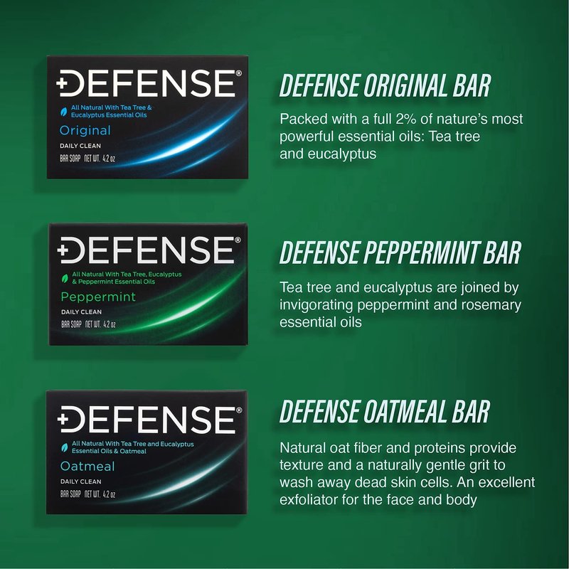 Defense Soap provides full strength antifungal, antiviral, and antibacterial natural essential oils. Defense Soap also provides a broad spectrum of benefits derived from Tea Tee Oil and Eucalyptus Oils, clinically proven natural ingredients effective at helping wash away bacteria and fungus. Proven in the world of contact sports, to efficiently removes dirt, grime, gym crud, sweat, smog, allergens, grunge, and built up oils. Defense Soap is triple milled for quality, consistency and longevity, built for a high density lather, deeply cleansing the pores. With superior rinsing action, Defense Soap restores the skin’s natural barrier while helping control the production of sebum and dead skin cells. Perfect for active lifestyles, supporting proper hygiene routines, and recommended after workouts. Defense’s natural deodorizing Ingredients helps wash away odor causing bacteria. Defense Soap is hypo allergenic, naturally free and clear, and formulated for sensitive skin, with no fragrances, dyes, cosmetics, petrochemical compounds, triclosan, alcohol or sodium lauryl sulfate.