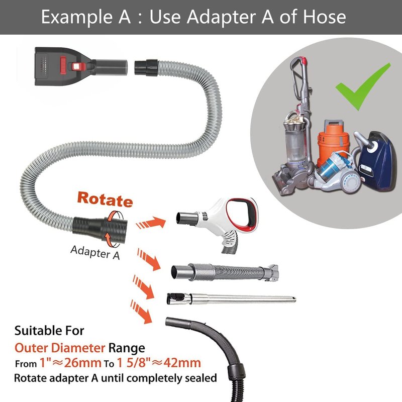 - Compatible with Most Vacuums. Various brands(Miele, Shark, Bissell, Hoover, Shop-Vac, Dirt Devil, Eureka, Kirby, Rainbow etc.) and types(Upright, Canister, Central Vac, Wet/Dry etc.), for the vacuum hose handle is circular shape (For Outer Diameter Range: 1"-1 5/8", 26mm-42mm connect with adapter A of extension hose end directly; For Inner Diameter Range: 1 1/4"-1 3/4", 32mm-44mm connect with adapter B and extension hose).